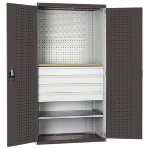 Werkplaatskast voor het overzichtelijk opbergen van uw gereedschap. Voorzien van perfogaten en sleufpanelen. Verstel eenvoudig per 25 mm de hoogte van de legborden en laden. Sluit de deuren veilig af met de driepuntssluiting en het cilinderslot.