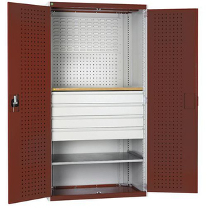 Werkplaatskast voor het overzichtelijk opbergen van uw gereedschap. Voorzien van perfogaten en sleufpanelen. Verstel eenvoudig per 25 mm de hoogte van de legborden en laden. Sluit de deuren veilig af met de driepuntssluiting en het cilinderslot.