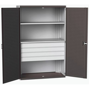 Gecombineerde zware kast Cubio, Lean Management: ja, Totale hoogte: 2000 mm, Aantal laden: 4, Totale breedte: 1300 mm, Aantal legborden: 2, Totale diepte: 650 mm, Hoogte lade: 4 x 125 mm, Kleur deur: Antraciet, Lade kleur: Lichtgrijs, Geleverd gemonteerd: ja, Recyclebare verpakking: Ja - 100%, Gerecyclede verpakkingen: 93 %, Aantal deuren: 2