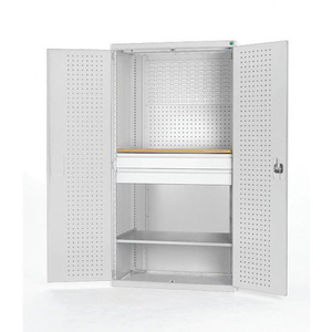 Werkblad van beukenmultiplex, dikte 25 mm Legborden van gegalvaniseerd staal verstelbaar in stappen van 25 mm Maximaal draagvermogen per legbord is 100 kg en 160 kg voor de breedte 1300mm Binnenladen gemonteerd op geleiders met lagers, draagvermogen 75 kg. Bekleding geperforeerde bodem of met bakken