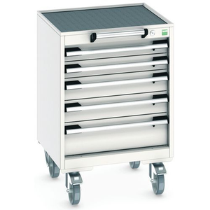 Mobiele ladekast Cubio, Totale hoogte: 785 mm, Aantal laden: 5, Totale breedte: 525 mm, Totale diepte: 525 mm, Kleur: Lichtgrijs, Totale hoogte lade: 2 x 75 ; 2 x 100 ; 1 x 150 mm, Kleur ombouw: Lichtgrijs, Max. belasting per lade: 50 kg, Max. belasting: 300 kg, RAL: 7035, Zwenkwiel Ø: 125 mm, Special Covid-19: nee, Aantal legborden: 0, Aantal zwenkwielen: 4, Recyclebare verpakking: Ja - 100%, Gerecyclede verpakkingen: 93 %, Gewicht: 81.99 kg, Type nr.: 40402011.16V, Lade kleur: Lichtgrijs