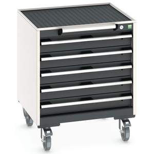 Mobiele ladekast Cubio, Totale hoogte: 785 mm, Aantal laden: 5, Totale breedte: 650 mm, Totale diepte: 650 mm, Kleur: Antraciet, Totale hoogte lade: 5 x 100 mm, Kleur ombouw: Lichtgrijs, Max. belasting per lade: 50 kg, Max. belasting: 300 kg, RAL: 7016, Zwenkwiel Ø: 125 mm, Special Covid-19: nee, Aantal legborden: 0, Aantal zwenkwielen: 4, Recyclebare verpakking: Ja - 100%, Gerecyclede verpakkingen: 93 %, Gewicht: 79.54 kg, Type nr.: 40402027.19V, Lade kleur: Antraciet