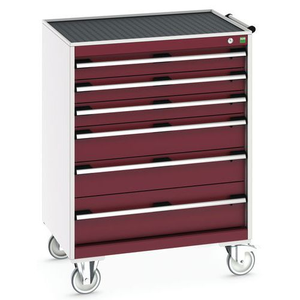 Verrijdbare werkplaatsladekast Cubio, Totale hoogte: 1085 mm, Aantal laden: 6, Totale breedte: 800 mm, Totale diepte: 650 mm, Kleur: Rood, Totale hoogte lade: 3 x 100 ; 2 x 150 ; 1 x 200 mm, Kleur ombouw: Lichtgrijs, Max. belasting per lade: 50 kg, Max. belasting: 600 kg, RAL: 3004, Zwenkwiel Ø: 125 mm, Special Covid-19: nee, Aantal legborden: 0, Aantal zwenkwielen: 4, Recyclebare verpakking: Ja - 100%, Gerecyclede verpakkingen: 93 %, Gewicht: 117.39 kg, Type nr.: 40402063.24V, Lade kleur: Rood