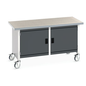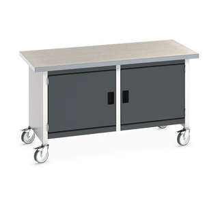 Verrijdbaar werkplaatsbank monobloc Cubio, Totale hoogte: 840 mm, Aantal laden: 0, Totale breedte: 1500 mm, Totale diepte: 750 mm, Kleur: Antraciet, Deurhoogte: 475 mm, Dikte tafelblad: 40 mm, Kleur ombouw: Lichtgrijs, Max. belasting: 300 kg, Aantal deuren: 2, RAL: 7016, Zwenkwiel Ø: 125 mm, Max. belasting per legbord: 100 kg, Special Covid-19: nee, Aantal legborden: 2, Aantal zwenkwielen: 4, Recyclebare verpakking: Ja - 100%, Gerecyclede verpakkingen: 93 %, Werkbank blad materiaal: Linoleum, Gewicht: 94.55 kg, Type nr.: 41002099.19V, Kleur deur: Antraciet