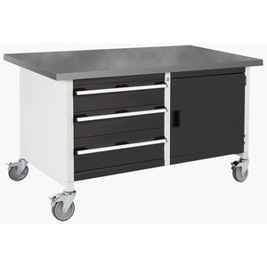 Verrijdbaar werkplaatsbank monobloc Cubio, Totale hoogte: 840 mm, Aantal laden: 3, Totale breedte: 1500 mm, Totale diepte: 750 mm, Kleur: Antraciet, Deurhoogte: 475 mm, Dikte tafelblad: 40 mm, Totale hoogte lade: 2 x 150 ; 1 x 200 mm, Kleur ombouw: Lichtgrijs, Max. belasting per lade: 75 kg, Max. belasting: 300 kg, Aantal deuren: 1, RAL: 7016, Zwenkwiel Ø: 125 mm, Max. belasting per legbord: 100 kg, Special Covid-19: nee, Aantal legborden: 1, Aantal zwenkwielen: 4, Recyclebare verpakking: Ja - 100%, Gerecyclede verpakkingen: 93 %, Werkbank blad materiaal: Linoleum, Gewicht: 110.9 kg, Type nr.: 41002102.19V, Lade kleur: Antraciet, Kleur deur: Antraciet