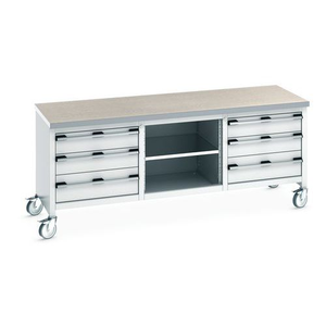 Verrijdbaar werkplaatsbank monobloc Cubio, Totale hoogte: 840 mm, Aantal laden: 6, Totale breedte: 2000 mm, Totale diepte: 750 mm, Kleur: Lichtgrijs, Dikte tafelblad: 40 mm, Totale hoogte lade: 4 x 150 ; 2 x 200 mm, Kleur ombouw: Lichtgrijs, Max. belasting per lade: 75 kg, Max. belasting: 300 kg, Aantal deuren: 0, RAL: 7035, Zwenkwiel Ø: 125 mm, Max. belasting per legbord: 100 kg, Special Covid-19: nee, Aantal legborden: 1, Aantal zwenkwielen: 4, Recyclebare verpakking: Ja - 100%, Gerecyclede verpakkingen: 93 %, Werkbank blad materiaal: Linoleum, Gewicht: 165.13 kg, Type nr.: 41002132.16V, Lade kleur: Lichtgrijs