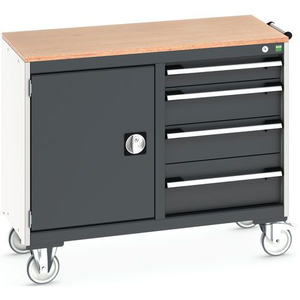 Werktafel voor onderhoud Cubio, Totale hoogte: 890 mm, Aantal laden: 4, Totale breedte: 1050 mm, Totale diepte: 525 mm, Kleur: Antraciet, Deurhoogte: 600 mm, Dikte tafelblad: 20 mm, Totale hoogte lade: 1 x 100 ; 2 x 150 ; 1 x 200 mm, Kleur ombouw: Lichtgrijs, Max. belasting per lade: 50 kg, Max. belasting: 600 kg, Aantal deuren: 1, RAL: 7016, Zwenkwiel Ø: 125 mm, Special Covid-19: nee, Aantal legborden: 0, Aantal zwenkwielen: 4, Recyclebare verpakking: Ja - 100%, Gerecyclede verpakkingen: 93 %, Gewicht: 84.04 kg, Type nr.: 41006004.19V, Lade kleur: Antraciet, Kleur deur: Antraciet