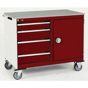 Werktafel voor onderhoud Cubio, Totale hoogte: 890 mm, Aantal laden: 4, Totale breedte: 1050 mm, Totale diepte: 525 mm, Kleur: Rood, Deurhoogte: 600 mm, Dikte tafelblad: 20 mm, Totale hoogte lade: 1 x 100 ; 2 x 150 ; 1 x 200 mm, Kleur ombouw: Lichtgrijs, Max. belasting per lade: 50 kg, Max. belasting: 600 kg, Aantal deuren: 1, RAL: 3004, Zwenkwiel Ø: 125 mm, Special Covid-19: nee, Aantal legborden: 0, Aantal zwenkwielen: 4, Recyclebare verpakking: Ja - 100%, Gerecyclede verpakkingen: 93 %, Gewicht: 94.81 kg, Type nr.: 41006005.24V, Lade kleur: Rood, Kleur deur: Rood