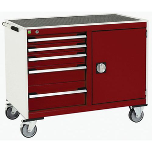 Werktafel voor onderhoud Cubio, Totale hoogte: 885 mm, Aantal laden: 5, Totale breedte: 1050 mm, Totale diepte: 525 mm, Kleur: Rood, Deurhoogte: 600 mm, Totale hoogte lade: 2 x 75 ; 1 x 100 ; 1 x 150 ; 1 x 200 mm, Kleur ombouw: Lichtgrijs, Max. belasting per lade: 50 kg, Max. belasting: 600 kg, Aantal deuren: 1, RAL: 3004, Zwenkwiel Ø: 125 mm, Special Covid-19: nee, Aantal legborden: 0, Aantal zwenkwielen: 4, Recyclebare verpakking: Ja - 100%, Gerecyclede verpakkingen: 93 %, Gewicht: 97 kg, Type nr.: 41006009.24V, Lade kleur: Rood, Kleur deur: Rood
