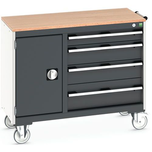 Werktafel voor onderhoud Cubio, Totale hoogte: 890 mm, Aantal laden: 4, Totale breedte: 1050 mm, Totale diepte: 525 mm, Kleur: Antraciet, Deurhoogte: 600 mm, Dikte tafelblad: 20 mm, Totale hoogte lade: 1 x 100 ; 2 x 150 ; 1 x 200 mm, Kleur ombouw: Lichtgrijs, Max. belasting per lade: 50 kg, Max. belasting: 600 kg, Aantal deuren: 1, RAL: 7016, Zwenkwiel Ø: 125 mm, Special Covid-19: nee, Aantal legborden: 0, Aantal zwenkwielen: 4, Recyclebare verpakking: Ja - 100%, Gerecyclede verpakkingen: 93 %, Gewicht: 94.48 kg, Type nr.: 41006010.19V, Lade kleur: Antraciet, Kleur deur: Antraciet