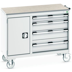 Werktafel voor onderhoud Cubio, Totale hoogte: 890 mm, Aantal laden: 4, Totale breedte: 1050 mm, Totale diepte: 525 mm, Kleur: Lichtgrijs, Deurhoogte: 600 mm, Dikte tafelblad: 20 mm, Totale hoogte lade: 1 x 100 ; 2 x 150 ; 1 x 200 mm, Kleur ombouw: Lichtgrijs, Max. belasting per lade: 50 kg, Max. belasting: 600 kg, Aantal deuren: 1, RAL: 7035, Zwenkwiel Ø: 125 mm, Special Covid-19: nee, Aantal legborden: 0, Aantal zwenkwielen: 4, Recyclebare verpakking: Ja - 100%, Gerecyclede verpakkingen: 93 %, Gewicht: 93.88 kg, Type nr.: 41006011.16V, Lade kleur: Lichtgrijs, Kleur deur: Lichtgrijs