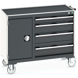 Werktafel voor onderhoud Cubio, Totale hoogte: 885 mm, Aantal laden: 4, Totale breedte: 1050 mm, Totale diepte: 525 mm, Kleur: Antraciet, Deurhoogte: 600 mm, Totale hoogte lade: 1 x 100 ; 2 x 150 ; 1 x 200 mm, Kleur ombouw: Lichtgrijs, Max. belasting per lade: 50 kg, Max. belasting: 600 kg, Aantal deuren: 1, RAL: 7016, Zwenkwiel Ø: 125 mm, Special Covid-19: nee, Aantal legborden: 0, Aantal zwenkwielen: 4, Recyclebare verpakking: Ja - 100%, Gerecyclede verpakkingen: 93 %, Gewicht: 98.96 kg, Type nr.: 41006012.19V, Lade kleur: Antraciet, Kleur deur: Antraciet