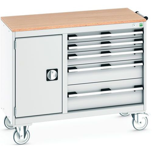 Werktafel voor onderhoud Cubio, Totale hoogte: 890 mm, Aantal laden: 5, Totale breedte: 1050 mm, Totale diepte: 525 mm, Kleur: Lichtgrijs, Deurhoogte: 600 mm, Dikte tafelblad: 20 mm, Totale hoogte lade: 2 x 75 ; 1 x 100 ; 1 x 150 ; 1 x 200 mm, Kleur ombouw: Lichtgrijs, Max. belasting per lade: 50 kg, Max. belasting: 600 kg, Aantal deuren: 1, RAL: 7035, Zwenkwiel Ø: 125 mm, Special Covid-19: nee, Aantal legborden: 0, Aantal zwenkwielen: 4, Recyclebare verpakking: Ja - 100%, Gerecyclede verpakkingen: 93 %, Gewicht: 97.38 kg, Type nr.: 41006013.16V, Lade kleur: Lichtgrijs, Kleur deur: Lichtgrijs