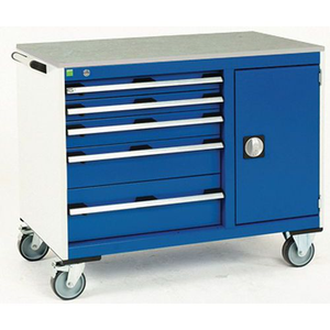 Werktafel voor onderhoud Cubio, Totale hoogte: 890 mm, Aantal laden: 5, Totale breedte: 1050 mm, Totale diepte: 525 mm, Kleur: Blauw, Deurhoogte: 600 mm, Dikte tafelblad: 20 mm, Totale hoogte lade: 2 x 75 ; 1 x 100 ; 1 x 150 ; 1 x 200 mm, Kleur ombouw: Lichtgrijs, Max. belasting per lade: 50 kg, Max. belasting: 600 kg, Aantal deuren: 1, RAL: 5010, Zwenkwiel Ø: 125 mm, Special Covid-19: nee, Aantal legborden: 0, Aantal zwenkwielen: 4, Recyclebare verpakking: Ja - 100%, Gerecyclede verpakkingen: 93 %, Gewicht: 97.38 kg, Type nr.: 41006014.11V, Lade kleur: Blauw, Kleur deur: Blauw