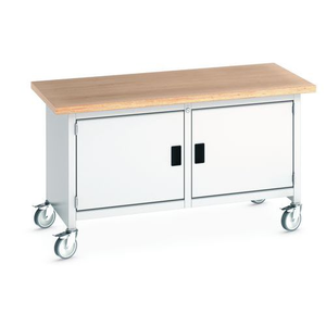 Verrijdbaar werkplaatsbank monobloc Cubio, Totale hoogte: 840 mm, Aantal laden: 0, Totale breedte: 1500 mm, Totale diepte: 750 mm, Kleur: Lichtgrijs, Deurhoogte: 475 mm, Dikte tafelblad: 40 mm, Kleur ombouw: Lichtgrijs, Max. belasting: 300 kg, Aantal deuren: 2, RAL: 7035, Zwenkwiel Ø: 125 mm, Max. belasting per legbord: 100 kg, Special Covid-19: nee, Aantal legborden: 2, Aantal zwenkwielen: 4, Recyclebare verpakking: Ja - 100%, Gerecyclede verpakkingen: 93 %, Werkbank blad materiaal: Beuk multiplex, Gewicht: 114.55 kg, Type nr.: 41002097.16V, Kleur deur: Lichtgrijs