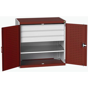 Gecombineerde zware kast Cubio, Lean Management: ja, Totale hoogte: 1000 mm, Aantal laden: 3, Totale breedte: 1050 mm, Aantal legborden: 1, Totale diepte: 650 mm, Hoogte lade: 3 x 125 mm, Kleur deur: Rood, Lade kleur: Lichtgrijs, Max. belasting per legbord: 100 kg, Geleverd gemonteerd: ja, Recyclebare verpakking: Ja - 100%, Gerecyclede verpakkingen: 93 %, Aantal deuren: 2