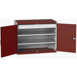 Gecombineerde zware kast Cubio, Lean Management: ja, Totale hoogte: 1000 mm, Aantal laden: 1, Totale breedte: 1300 mm, Aantal legborden: 2, Totale diepte: 650 mm, Hoogte lade: 1 x 125 mm, Kleur deur: Rood, Lade kleur: Lichtgrijs, Geleverd gemonteerd: ja, Recyclebare verpakking: Ja - 100%, Gerecyclede verpakkingen: 93 %, Aantal deuren: 2