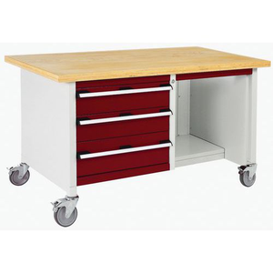 Verrijdbaar werkplaatsbank monobloc Cubio, Totale hoogte: 840 mm, Aantal laden: 3, Totale breedte: 1500 mm, Totale diepte: 750 mm, Kleur: Rood, Dikte tafelblad: 40 mm, Totale hoogte lade: 2 x 150 ; 1 x 200 mm, Kleur ombouw: Lichtgrijs, Max. belasting per lade: 75 kg, Max. belasting: 300 kg, RAL: 3004, Zwenkwiel Ø: 125 mm, Special Covid-19: nee, Aantal legborden: 0, Aantal zwenkwielen: 4, Recyclebare verpakking: Ja - 100%, Gerecyclede verpakkingen: 93 %, Werkbank blad materiaal: Beuk multiplex, Gewicht: 124.24 kg, Type nr.: 41002115.24V, Lade kleur: Rood