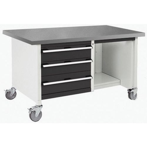 Verrijdbaar werkplaatsbank monobloc Cubio, Totale hoogte: 840 mm, Aantal laden: 3, Totale breedte: 1500 mm, Totale diepte: 750 mm, Kleur: Antraciet, Dikte tafelblad: 40 mm, Totale hoogte lade: 2 x 150 ; 1 x 200 mm, Kleur ombouw: Lichtgrijs, Max. belasting per lade: 75 kg, Max. belasting: 300 kg, Aantal deuren: 0, RAL: 7016, Zwenkwiel Ø: 125 mm, Special Covid-19: nee, Aantal legborden: 0, Aantal zwenkwielen: 4, Recyclebare verpakking: Ja - 100%, Gerecyclede verpakkingen: 93 %, Werkbank blad materiaal: Linoleum, Gewicht: 104.24 kg, Type nr.: 41002117.19V, Lade kleur: Antraciet