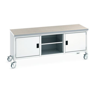 Verrijdbaar werkplaatsbank monobloc Cubio, Totale hoogte: 840 mm, Aantal laden: 0, Totale breedte: 2000 mm, Totale diepte: 750 mm, Kleur: Lichtgrijs, Deurhoogte: 475 mm, Dikte tafelblad: 40 mm, Kleur ombouw: Lichtgrijs, Max. belasting: 300 kg, Aantal deuren: 2, RAL: 7035, Zwenkwiel Ø: 125 mm, Max. belasting per legbord: 100 kg, Special Covid-19: nee, Aantal legborden: 3, Aantal zwenkwielen: 4, Recyclebare verpakking: Ja - 100%, Gerecyclede verpakkingen: 93 %, Werkbank blad materiaal: Linoleum, Gewicht: 132.43 kg, Type nr.: 41002120.16V, Kleur deur: Lichtgrijs
