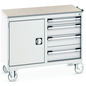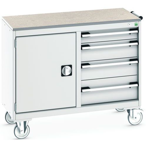 Werktafel voor onderhoud Cubio, Totale hoogte: 890 mm, Aantal laden: 4, Totale breedte: 1050 mm, Totale diepte: 525 mm, Kleur: Lichtgrijs, Deurhoogte: 600 mm, Dikte tafelblad: 20 mm, Totale hoogte lade: 1 x 100 ; 2 x 150 ; 1 x 200 mm, Kleur ombouw: Lichtgrijs, Max. belasting per lade: 50 kg, Max. belasting: 600 kg, Aantal deuren: 1, RAL: 7035, Zwenkwiel Ø: 125 mm, Special Covid-19: nee, Aantal legborden: 0, Aantal zwenkwielen: 4, Recyclebare verpakking: Ja - 100%, Gerecyclede verpakkingen: 93 %, Gewicht: 94.81 kg, Type nr.: 41006005.16V, Lade kleur: Lichtgrijs, Kleur deur: Lichtgrijs