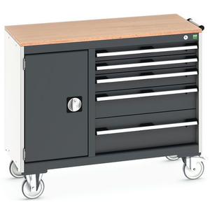 Werktafel voor onderhoud Cubio, Totale hoogte: 890 mm, Aantal laden: 5, Totale breedte: 1050 mm, Totale diepte: 525 mm, Kleur: Antraciet, Deurhoogte: 600 mm, Dikte tafelblad: 20 mm, Totale hoogte lade: 2 x 75 ; 1 x 100 ; 1 x 150 ; 1 x 200 mm, Kleur ombouw: Lichtgrijs, Max. belasting per lade: 50 kg, Max. belasting: 600 kg, Aantal deuren: 1, RAL: 7016, Zwenkwiel Ø: 125 mm, Special Covid-19: nee, Aantal legborden: 0, Aantal zwenkwielen: 4, Recyclebare verpakking: Ja - 100%, Gerecyclede verpakkingen: 93 %, Gewicht: 97.38 kg, Type nr.: 41006013.19V, Lade kleur: Antraciet, Kleur deur: Antraciet