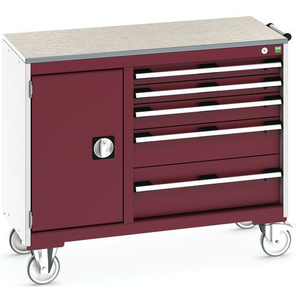 Werktafel voor onderhoud Cubio, Totale hoogte: 890 mm, Aantal laden: 5, Totale breedte: 1050 mm, Totale diepte: 525 mm, Kleur: Rood, Deurhoogte: 600 mm, Dikte tafelblad: 20 mm, Totale hoogte lade: 2 x 75 ; 1 x 100 ; 1 x 150 ; 1 x 200 mm, Kleur ombouw: Lichtgrijs, Max. belasting per lade: 50 kg, Max. belasting: 600 kg, Aantal deuren: 1, RAL: 3004, Zwenkwiel Ø: 125 mm, Special Covid-19: nee, Aantal legborden: 0, Aantal zwenkwielen: 4, Recyclebare verpakking: Ja - 100%, Gerecyclede verpakkingen: 93 %, Gewicht: 97.38 kg, Type nr.: 41006014.24V, Lade kleur: Rood, Kleur deur: Rood