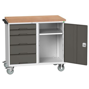 Gereedschapswagen Bott met deuren en laden, Totale hoogte: 980 mm, Aantal laden: 5, Totale breedte: 1050 mm, Totale diepte: 600 mm, Kleur: Antraciet, Deurhoogte: 725 mm, Dikte tafelblad: 30 mm, Totale hoogte lade: 2 x 100 ; 3 x 175 mm, Kleur ombouw: Lichtgrijs, Max. belasting per lade: 50 kg, Max. belasting: 300 kg, Aantal deuren: 1, RAL: 7016, Zwenkwiel Ø: 125 mm, Max. belasting per legbord: 75 kg, Special Covid-19: nee, Aantal legborden: 1, Aantal zwenkwielen: 4, Recyclebare verpakking: Ja - 100%, Gerecyclede verpakkingen: 93 %, Werkbank blad materiaal: Beuk multiplex, Gewicht: 104.04 kg, Type nr.: 16927121.19, Lade kleur: Antraciet, Kleur deur: Antraciet