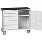 Constructie van gelast plaatstaal Het vak met deur is uitgerust met een legbord van gegalvaniseerd staal, in hoogte verstelbaar Draagvermogen per legbord 60 kg Laden kunnen 100% geopend worden, belasting 50 kg Beveiligingsmechanisme dat ervoor zorgt dat de laden niet per ongeluk opengaan. Handgreep 4 wielen met een diameter van 125 mm, 2 bokwielen en 2 zwenkwielen met rem Maximaal toelaatbare belasting 200 kg Breedte 1050 mm Hoogte 980 mm, diepte 600 mm met tafelblad dikte 30 mm Hoogte 965 mm, diepte 550 mm met bovenkant met 3 opstaande randen