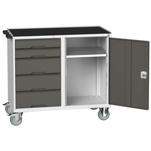 Verrijdbare Combikast Verso, Totale hoogte: 965 mm, Aantal laden: 5, Totale breedte: 1050 mm, Totale diepte: 550 mm, Kleur: Antraciet, Deurhoogte: 725 mm, Totale hoogte lade: 2 x 100 ; 3 x 175 mm, Kleur ombouw: Lichtgrijs, Max. belasting per lade: 50 kg, Max. belasting: 300 kg, Aantal deuren: 1, RAL: 7016, Zwenkwiel Ø: 125 mm, Max. belasting per legbord: 75 kg, Special Covid-19: nee, Aantal legborden: 1, Aantal zwenkwielen: 4, Recyclebare verpakking: Ja - 100%, Gerecyclede verpakkingen: 93 %, Gewicht: 92.03 kg, Type nr.: 16927122.19, Lade kleur: Antraciet, Kleur deur: Antraciet