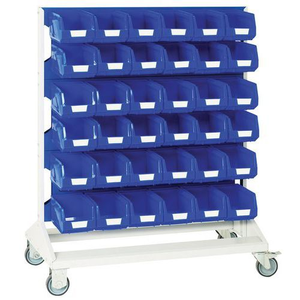 Paneel rek voor verrijdbare bak, Totale hoogte: 1250 mm, Totale breedte: 1000 mm, Totale diepte: 550 mm, Bak kleur: Blauw, Aantal bakken/kleuren/vermogen: 72 Blauw, Aantal bakken: 72, Kleur ombouw: Lichtgrijs, Materiaal: Metaal, Materiaal: Staal, Verrijdbaar: ja, Recyclebare verpakking: Ja - 100%, Gerecyclede verpakkingen: 93 %, Model: Paneel rek verrijdbaar, Type: Mobiel bakkenrek, Gebruik: Opslaan, Coating: Epoxy, Kleur: Blauw