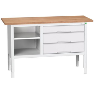 Werkbank monobloc Verso, Max. belasting: 800 kg, Totale hoogte: 930 mm, Totale breedte: 1500 mm, Werkbank blad materiaal: Beuk multiplex, Breedte: 1500 mm, Diepte: 600 mm, Totale diepte: 600 mm, Frame kleur: Lichtgrijs, Hoogte: 930 mm, Werkhoogte: 930 mm, Min. verstelbare hoogte: 830 mm, Max. verstelbare hoogte: 930 mm, Dikte tafelblad: 30 mm, Aantal laden: 3, Aantal legborden: 1, Hoogte lade: 1 x 125 ; 2 x 175 mm, Kleur: Lichtgrijs, Lade kleur: Lichtgrijs, RAL: 7035, Max. belasting lade: 75 kg, Special Covid-19: nee, Recyclebare verpakking: Ja - 100%, Gerecyclede verpakkingen: 93 %, Gewicht: 115.8 kg, Diepte tafelblad: 600 mm