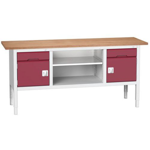 Werkbank monobloc Verso, Max. belasting: 800 kg, Totale hoogte: 930 mm, Totale breedte: 2000 mm, Werkbank blad materiaal: Beuk multiplex, Breedte: 2000 mm, Diepte: 600 mm, Totale diepte: 600 mm, Frame kleur: Lichtgrijs, Hoogte: 930 mm, Werkhoogte: 930 mm, Min. verstelbare hoogte: 830 mm, Max. verstelbare hoogte: 930 mm, Dikte tafelblad: 30 mm, Aantal laden: 2, Aantal legborden: 1, Hoogte lade: 2 x 125 mm, Aantal deuren: 2, Kleur: Rood, Kleur deur: Rood, Lade kleur: Rood, RAL: 3004, Max. belasting lade: 75 kg, Special Covid-19: nee, Recyclebare verpakking: Ja - 100%, Gerecyclede verpakkingen: 93 %, Gewicht: 125.18 kg, Diepte tafelblad: 600 mm