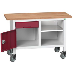 Verrijdbaar werkbank uit één stuk Verso 1250x600 M1, Totale hoogte: 830 mm, Aantal laden: 1, Totale breedte: 1250 mm, Totale diepte: 600 mm, Kleur: Rood, Deurhoogte: 350 mm, Dikte tafelblad: 30 mm, Totale hoogte lade: 1 x 125 mm, Kleur ombouw: Lichtgrijs, Max. belasting per lade: 75 kg, Max. belasting: 300 kg, Aantal deuren: 1, RAL: 3004, Zwenkwiel Ø: 125 mm, Max. belasting per legbord: 75 kg, Special Covid-19: nee, Aantal legborden: 1, Aantal zwenkwielen: 4, Recyclebare verpakking: Ja - 100%, Gerecyclede verpakkingen: 93 %, Werkbank blad materiaal: Beuk multiplex, Gewicht: 87.73 kg, Type nr.: 16923200.24, Lade kleur: Rood, Kleur deur: Rood