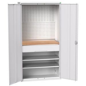Bewaar uw spullen geordend in deze ladekast voor de werkplaats. Bodem van geperforeerde panelen en sleuvenpanelen voor bakken. Legbord eenvoudig in hoogte verstelbaar. Sluit de deuren veilig af met de driepuntssluiting en het cilinderslot. Met lades op kogellagers, voor soepel openen en sluiten.