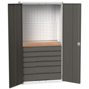 Bewaar uw spullen geordend in deze ladekast voor de werkplaats. Bodem van geperforeerde panelen en sleuvenpanelen voor bakken. Legbord eenvoudig in hoogte verstelbaar. Sluit de deuren veilig af met de driepuntssluiting en het cilinderslot. Met lades op kogellagers, voor soepel openen en sluiten.