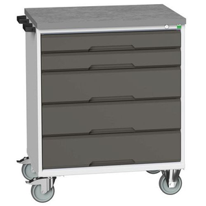 Verrijdbare gereedschapswagen Verso, Totale hoogte: 980 mm, Aantal laden: 5, Totale breedte: 800 mm, Totale diepte: 600 mm, Kleur: Antraciet, Totale hoogte lade: 2 x 100 ; 3 x 175 mm, Kleur ombouw: Lichtgrijs, Max. belasting per lade: 50 kg, Max. belasting: 300 kg, RAL: 7016, Zwenkwiel Ø: 125 mm, Special Covid-19: nee, Aantal legborden: 0, Aantal zwenkwielen: 4, Recyclebare verpakking: Ja - 100%, Gerecyclede verpakkingen: 93 %, Gewicht: 88.46 kg, Type nr.: 16927000.19, Lade kleur: Antraciet