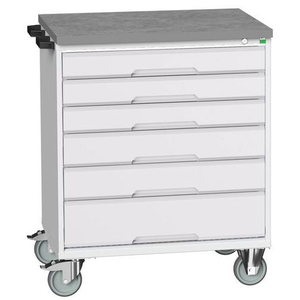 Verrijdbare gereedschapswagen Verso, Totale hoogte: 980 mm, Aantal laden: 6, Totale breedte: 800 mm, Totale diepte: 600 mm, Kleur: Lichtgrijs, Totale hoogte lade: 3 x 100 ; 2 x 125 ; 1 x 175 mm, Kleur ombouw: Lichtgrijs, Max. belasting per lade: 50 kg, Max. belasting: 300 kg, RAL: 7035, Zwenkwiel Ø: 125 mm, Special Covid-19: nee, Aantal legborden: 0, Aantal zwenkwielen: 4, Recyclebare verpakking: Ja - 100%, Gerecyclede verpakkingen: 93 %, Gewicht: 92.63 kg, Type nr.: 16927003.16, Lade kleur: Lichtgrijs