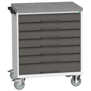 Verrijdbare gereedschapswagen Verso 800 x 550 x 980, Totale hoogte: 980 mm, Aantal laden: 7, Totale breedte: 800 mm, Totale diepte: 600 mm, Kleur: Antraciet, Totale hoogte lade: 6 x 100 ; 1 x 125 mm, Kleur ombouw: Lichtgrijs, Max. belasting per lade: 50 kg, Max. belasting: 300 kg, RAL: 7016, Zwenkwiel Ø: 125 mm, Special Covid-19: nee, Aantal legborden: 0, Aantal zwenkwielen: 4, Recyclebare verpakking: Ja - 100%, Gerecyclede verpakkingen: 93 %, Gewicht: 97.1 kg, Type nr.: 16927006.19, Lade kleur: Antraciet