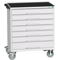 Verrijdbare gereedschapswagen Verso 800 x 550 x 965, Totale hoogte: 965 mm, Aantal laden: 7, Totale breedte: 800 mm, Totale diepte: 550 mm, Kleur: Lichtgrijs, Totale hoogte lade: 6 x 100 ; 1 x 125 mm, Kleur ombouw: Lichtgrijs, Max. belasting per lade: 50 kg, Max. belasting: 300 kg, RAL: 7035, Zwenkwiel Ø: 125 mm, Special Covid-19: nee, Aantal legborden: 0, Aantal zwenkwielen: 4, Recyclebare verpakking: Ja - 100%, Gerecyclede verpakkingen: 93 %, Gewicht: 89.44 kg, Type nr.: 16927008.16, Lade kleur: Lichtgrijs