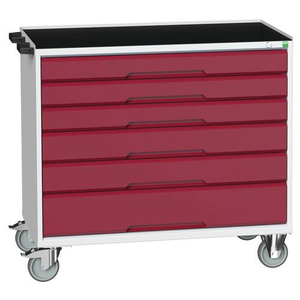 Verrijdbare gereedschapswagen Verso, Totale hoogte: 965 mm, Aantal laden: 6, Totale breedte: 1050 mm, Totale diepte: 550 mm, Kleur: Rood, Totale hoogte lade: 3 x 100 ; 2 x 125 ; 1 x 175 mm, Kleur ombouw: Lichtgrijs, Max. belasting per lade: 50 kg, Max. belasting: 300 kg, RAL: 3004, Zwenkwiel Ø: 125 mm, Special Covid-19: nee, Aantal legborden: 0, Aantal zwenkwielen: 4, Recyclebare verpakking: Ja - 100%, Gerecyclede verpakkingen: 93 %, Gewicht: 108.41 kg, Type nr.: 16927055.24, Lade kleur: Rood