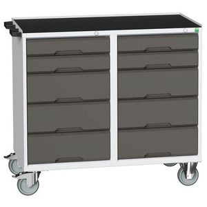 Verrijdbare Combikast Verso, Totale hoogte: 965 mm, Aantal laden: 10, Totale breedte: 1050 mm, Totale diepte: 550 mm, Kleur: Antraciet, Totale hoogte lade: 4 x 100 ; 6x 175 mm, Kleur ombouw: Lichtgrijs, Max. belasting per lade: 50 kg, Max. belasting: 300 kg, RAL: 7016, Zwenkwiel Ø: 125 mm, Special Covid-19: nee, Aantal legborden: 0, Aantal zwenkwielen: 4, Recyclebare verpakking: Ja - 100%, Gerecyclede verpakkingen: 93 %, Gewicht: 119.82 kg, Type nr.: 16927102.19, Lade kleur: Antraciet