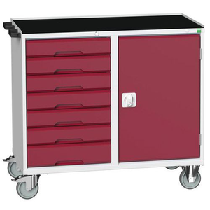 Verrijdbare Combikast Verso, Totale hoogte: 965 mm, Aantal laden: 7, Totale breedte: 1050 mm, Totale diepte: 550 mm, Kleur: Rood, Deurhoogte: 675 mm, Totale hoogte lade: 6 x 100 ; 1 x 125 mm, Kleur ombouw: Lichtgrijs, Max. belasting per lade: 50 kg, Max. belasting: 300 kg, Aantal deuren: 1, RAL: 3004, Zwenkwiel Ø: 125 mm, Max. belasting per legbord: 75 kg, Special Covid-19: nee, Aantal legborden: 1, Aantal zwenkwielen: 4, Recyclebare verpakking: Ja - 100%, Gerecyclede verpakkingen: 93 %, Gewicht: 98.88 kg, Type nr.: 16927128.24, Lade kleur: Rood, Kleur deur: Rood