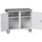 Constructie van gelast plaatstaal Het vak met deur is uitgerust met een legbord van gegalvaniseerd staal, in hoogte verstelbaar Draagvermogen per legbord 60 kg Laden kunnen 100% geopend worden, belasting 50 kg Beveiligingsmechanisme dat ervoor zorgt dat de laden niet per ongeluk opengaan. Handgreep 4 wielen met een diameter van 125 mm, 2 bokwielen en 2 zwenkwielen met rem Maximaal toelaatbare belasting 200 kg Breedte 1050 mm Hoogte 980 mm, diepte 600 mm met tafelblad dikte 30 mm Hoogte 965 mm, diepte 550 mm met bovenkant met 3 opstaande randen