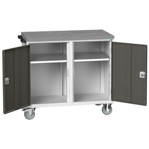 Verrijdbare Combikast Verso, Totale hoogte: 980 mm, Aantal laden: 0, Totale breedte: 1050 mm, Totale diepte: 600 mm, Kleur: Antraciet, Deurhoogte: 725 mm, Kleur ombouw: Lichtgrijs, Max. belasting: 300 kg, Aantal deuren: 2, RAL: 7016, Zwenkwiel Ø: 125 mm, Max. belasting per legbord: 75 kg, Special Covid-19: nee, Aantal legborden: 2, Aantal zwenkwielen: 4, Recyclebare verpakking: Ja - 100%, Gerecyclede verpakkingen: 93 %, Gewicht: 73.31 kg, Type nr.: 16927140.19, Kleur deur: Antraciet