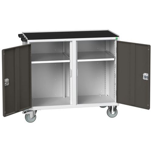 Verrijdbare Combikast Verso, Totale hoogte: 965 mm, Aantal laden: 0, Totale breedte: 1050 mm, Totale diepte: 550 mm, Kleur: Antraciet, Deurhoogte: 700 mm, Kleur ombouw: Lichtgrijs, Max. belasting: 300 kg, Aantal deuren: 2, RAL: 7016, Zwenkwiel Ø: 125 mm, Max. belasting per legbord: 75 kg, Special Covid-19: nee, Aantal legborden: 2, Aantal zwenkwielen: 4, Recyclebare verpakking: Ja - 100%, Gerecyclede verpakkingen: 93 %, Gewicht: 63.47 kg, Type nr.: 16927142.19, Kleur deur: Antraciet