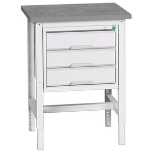 Werktafel verstelbare hoogte met lade Verso, Totale hoogte: 930 mm, Aantal laden: 3, Totale breedte: 700 mm, Totale diepte: 600 mm, Kleur: Lichtgrijs, Dikte tafelblad: 30 mm, Totale hoogte lade: 3 x 175 mm, Kleur ombouw: Lichtgrijs, Max. belasting per lade: 75 kg, Max. belasting: 300 kg, RAL: 7035, Zwenkwiel Ø: 125 mm, Special Covid-19: nee, Aantal legborden: 0, Aantal zwenkwielen: 4, Recyclebare verpakking: Ja - 100%, Gerecyclede verpakkingen: 93 %, Werkbank blad materiaal: Linoleum, Gewicht: 53 kg, Type nr.: 16921603.16, Min. verstelbare hoogte: 780 mm, Max. verstelbare hoogte: 930 mm, Lade kleur: Lichtgrijs