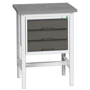 Werktafel verstelbare hoogte met lade Verso, Totale hoogte: 930 mm, Aantal laden: 3, Totale breedte: 700 mm, Totale diepte: 600 mm, Kleur: Antraciet, Dikte tafelblad: 30 mm, Totale hoogte lade: 3 x 175 mm, Kleur ombouw: Lichtgrijs, Max. belasting per lade: 75 kg, Max. belasting: 300 kg, RAL: 7016, Zwenkwiel Ø: 125 mm, Special Covid-19: nee, Aantal legborden: 0, Aantal zwenkwielen: 4, Recyclebare verpakking: Ja - 100%, Gerecyclede verpakkingen: 93 %, Werkbank blad materiaal: Linoleum, Gewicht: 53 kg, Type nr.: 16921603.19, Min. verstelbare hoogte: 780 mm, Max. verstelbare hoogte: 930 mm, Lade kleur: Antraciet