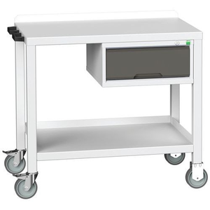 Stevig frame van gelast staal. Voor een industriƫle omgeving en voor onderhoud. 2 kwaliteiten naar keuze. Dikte 20 mm 2 lengtes (1000 of 1500 mm) 2 hoogtes: stalen bovenkant 910 mm, multiplex bovenkant 930 mm Diepte 600 mm Onderste legbord met 4 opstaande randen Verrijdbare versie is uitgerust met 4 wielen met diameter 125 mm (2 vaste en 2 zwenkwielen met rem) en 1 handgreep Ladeblok en lade voor het opbergen Gemonteerd geleverd