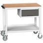 Stevig frame van gelast staal. Voor een industriƫle omgeving en voor onderhoud. 2 kwaliteiten naar keuze. Dikte 20 mm 2 lengtes (1000 of 1500 mm) 2 hoogtes: stalen bovenkant 910 mm, multiplex bovenkant 930 mm Diepte 600 mm Onderste legbord met 4 opstaande randen Verrijdbare versie is uitgerust met 4 wielen met diameter 125 mm (2 vaste en 2 zwenkwielen met rem) en 1 handgreep Ladeblok en lade voor het opbergen Gemonteerd geleverd